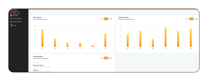 The analytics tab includes various graphs to see how CareerViewXR is being used in your organization. This information includes: user sessions, session duration, and top experiences. The data can be filtered by year, month, and week.